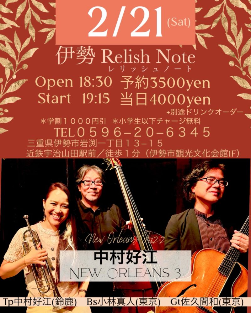中村好江 NEW ORLEANS 3 ライブ 2026.02.09 2月21日(土)Open 18:30 Start 19:15予約3500yen 当日4000yen(+別途ドリンクオーダー)Tp中村好江(鈴鹿)Bs小林真人(東京)Gt佐久間和(東京)